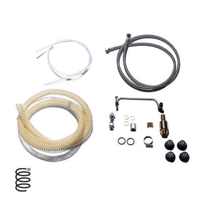 The La Marzocco  Linea Micra plumb in kit includes all the parts necessary to convert your Linea Micra reservoir machine to a plumb in version.  It comes with the braided hose for incoming water, the clear armored hose for draining the drip tray, and all of the installation pieces to help you convert your machine.